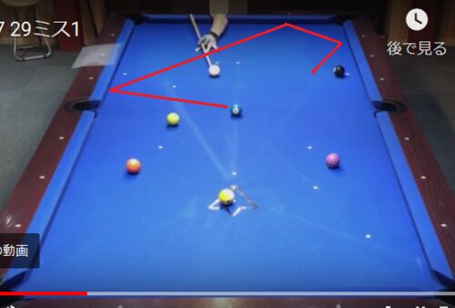 7 29ミス1 ②→④ バカやってます。 何を考えていたかって言うとですね・・・。 「②を入れて左長に入れて戻せば出せるはず。でも、サイドへのスクラッチが怖いのでしっかり引きを掛けたい。そうするとどうしても④番から離れて行ってしまいそう。 どうせなら右捻…